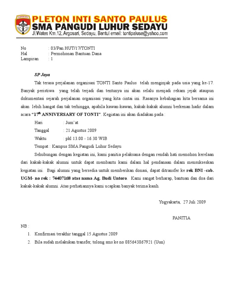 Sebagai platform pengembangan dana yang optimal dengan bunga hingga 21% per tahun kamu dapat memulainya hanya dengan rp100 ribu saja. Kamu juga harus menjelaskan alasan mengapa memohon bantuan dana. Saya yang betanda tangan dibawah ini :nama: Kami harap permohonan kami dapat diterima dan diberikan izin agar pelaksanaan acara berjalan lancar. Di dalamnya terdapat struktur meliputi pembukaan, isi dan penutup.